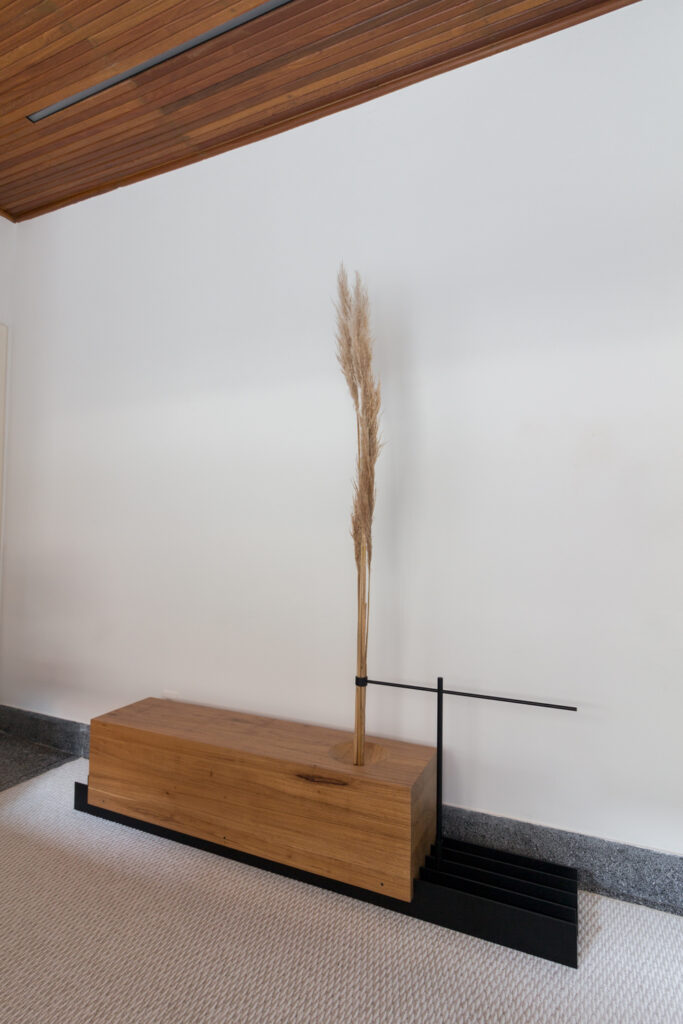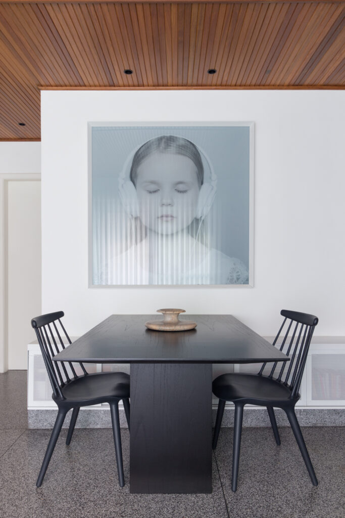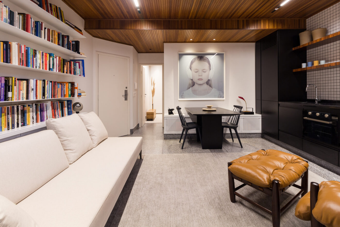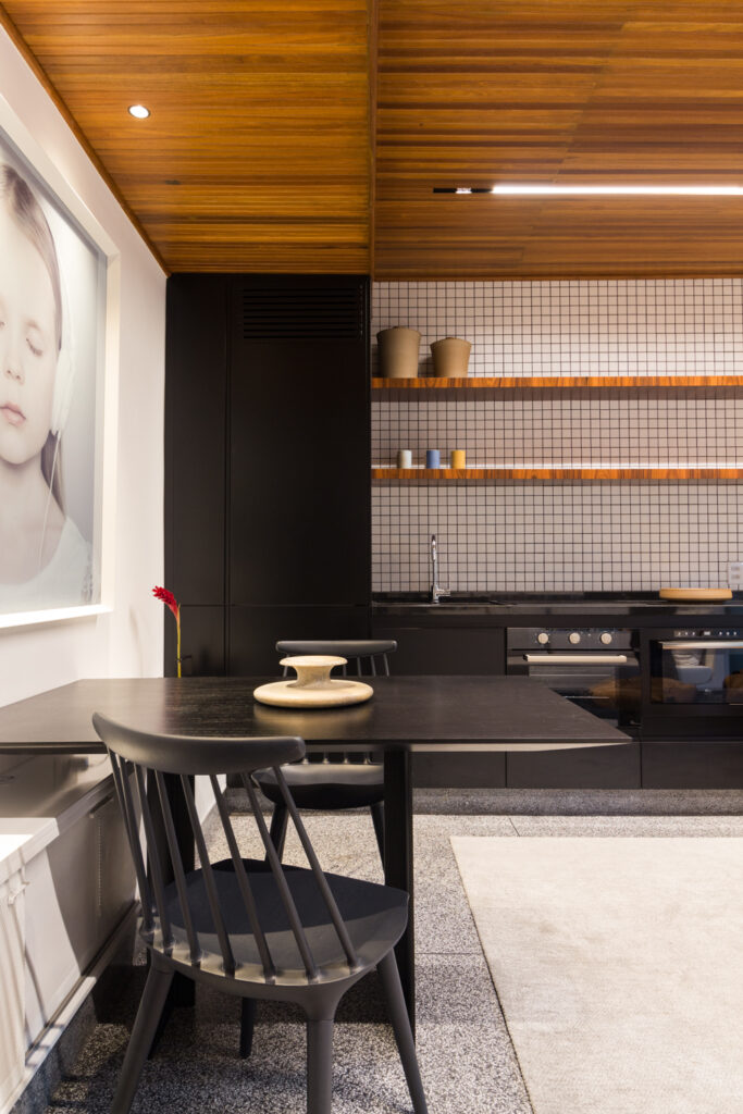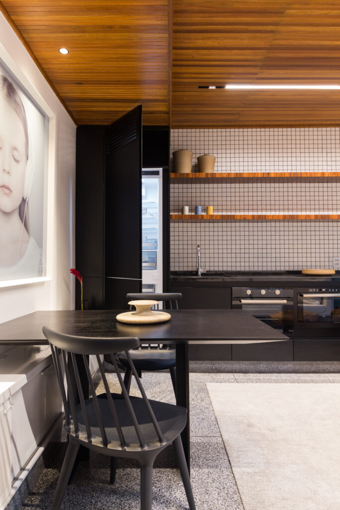 Um fator preponderante para essa flexibilização dos usos foi a redução da área reservada para a cozinha. Isso foi obtido com uma cuidadosa otimização do layout, a substituição dos armários, feitos sob medida, e a escolha por eletrodomésticos mais discretos e compactos – a geladeira, por exemplo, é de um modelo especial que permite que o equipamento fique embutido na marcenaria. O resultado é uma cozinha que, além de não ocupar muito espaço, é discreta e não interfere na natureza convidativa da sala.