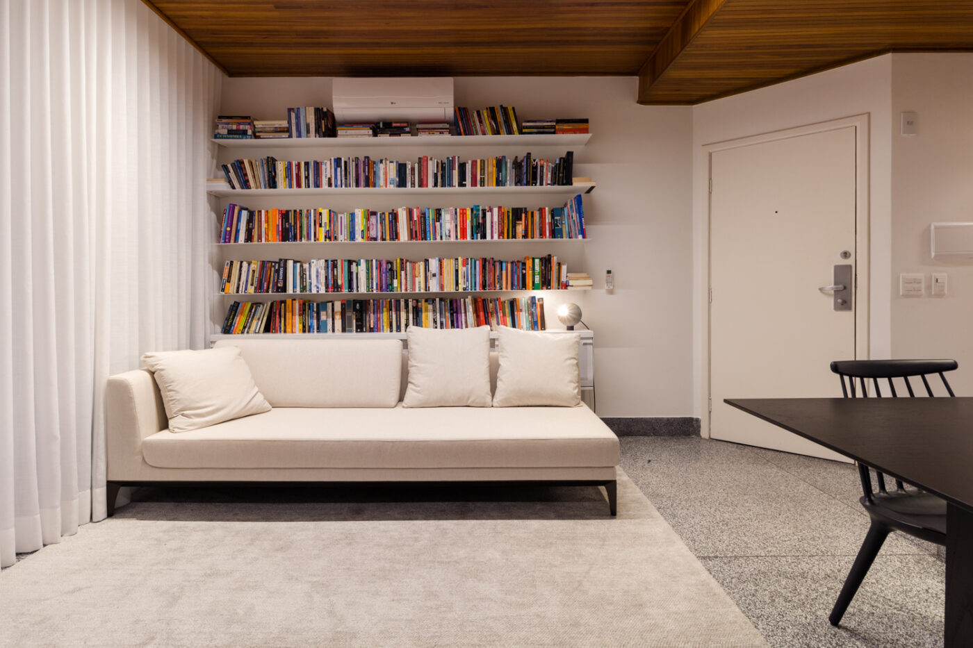 Na sala, havia uma bancada no meio do cômodo que servia para isolar a área destinada à cozinha. Ela foi substituída por outra, mais próxima à parede, desobstruindo a passagem e criando uma área mais aberta e capaz de atender a diversas novas funções – se necessário, ela agora pode servir como escritório ou sala de leitura, por exemplo.
