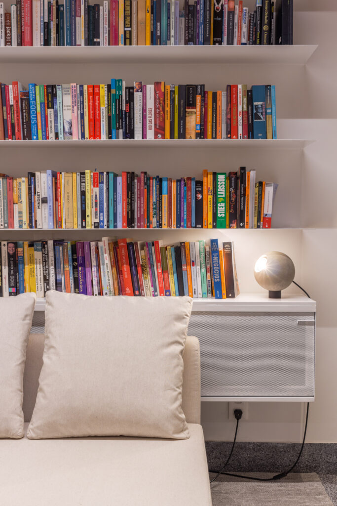 A preocupação com o aconchego também se reflete no uso do lambri como acabamento em quase todo o apartamento. As réguas de madeira possuem uma largura de 3,5 centímetros – exatamente a mesma medida das luminárias em perfil escolhidas para este projeto. Com isso, elas puderam ser instaladas em intervalos regulares nos painéis de madeira, cada uma ocupando o espaço de uma régua e encaixando-se perfeitamente neste elemento.