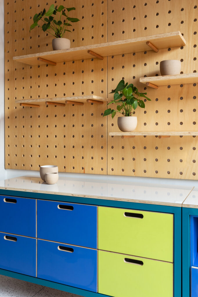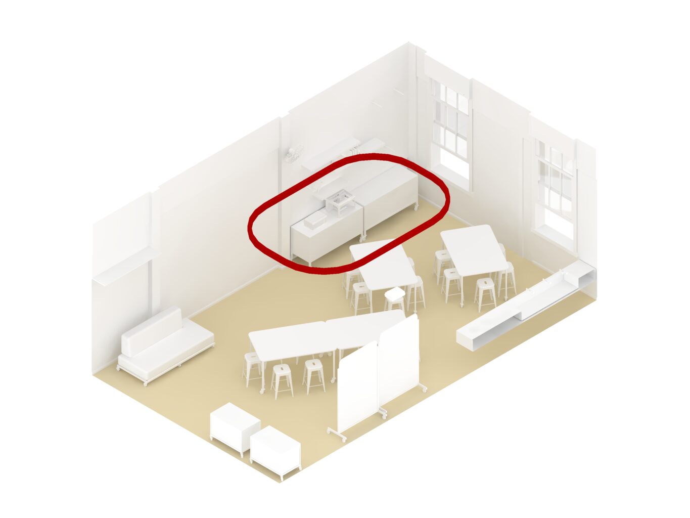 Além das mesas com banquetas, foram projetados bancadas com gavetas grandes, quadros móveis, mapoteca digital, parede com sistema customizável de prateleiras e suporte para ferramentas, além de um tanque.