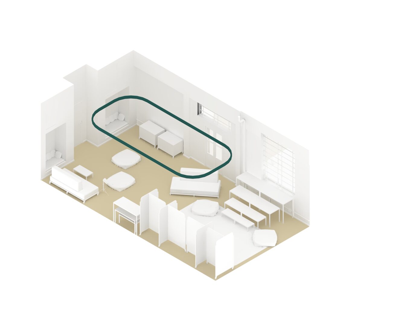 Para esse espaço foi utilizado um sistema de quadros lousa “T” que permitisse diferentes conformações de layouts como por exemplo exposição, separação do espaço para jogos didáticos, criação de micro espaços mais resguardados, fundo para um ensaio de teatro, entre outras possibilidades.