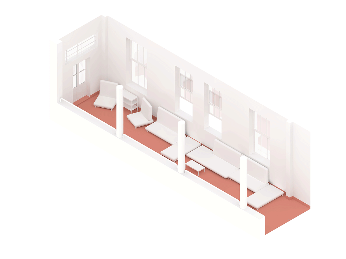 Também foi desenvolvido um conjunto de superfícies de alturas variadas que podem formar uma arquibancada mas, separadamente, atendem diversas posturas e funções como suporte de colo para notebook, bancos para sentar, mesas de altura convencional ou mesas altas.