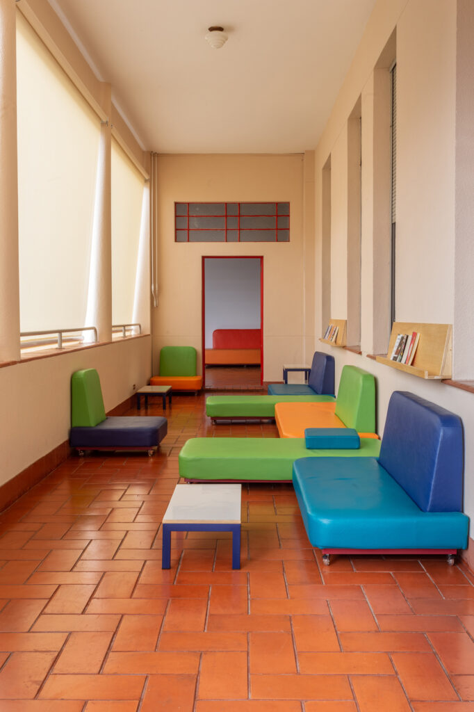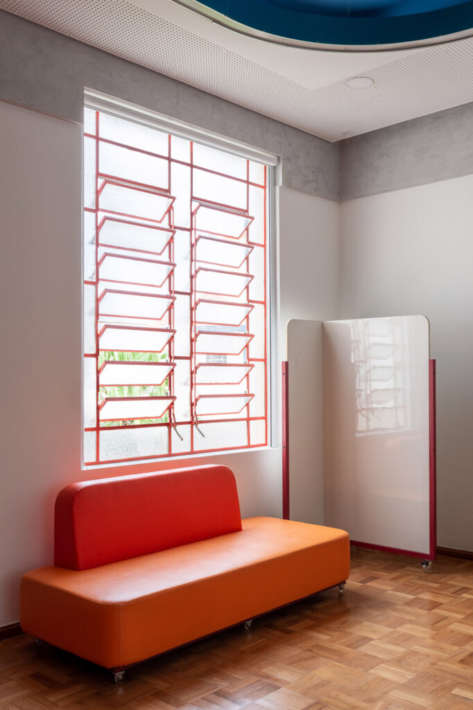 A varanda adjacente que antes funcionava apenas como circulação também recebeu uma intervenção para configurar mais um espaço de descompressão para os alunos com mobiliário despojado, suporte para livros e persianas para a proteção do sol.